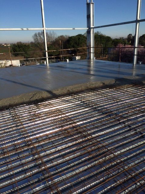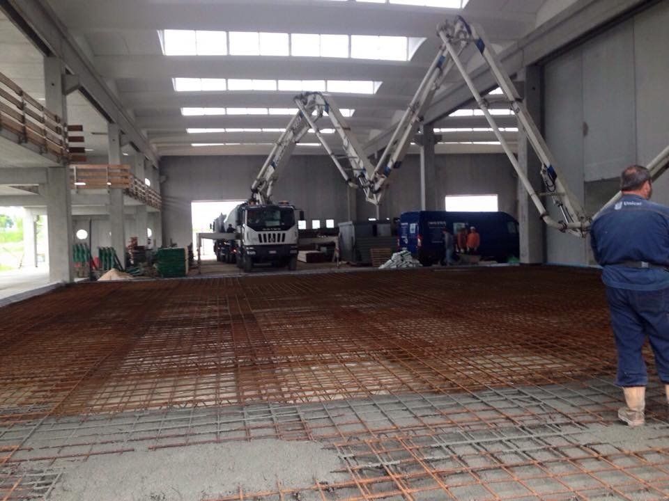 Reinforced concrete with electro-welded mesh, steel fibres and polypropylene structural fibres is then spread, smoothed and trowelled using mechanical tools. The surface is then dusted with a quartz-based hardener of different colours.